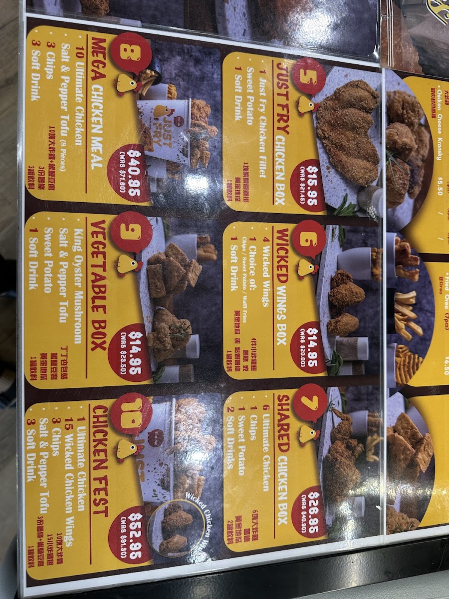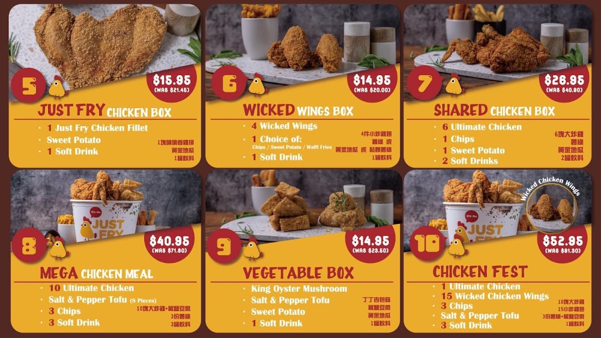 10 Ultimate Chicken Pieces Salt & Pepper Tofu (8 Pieces) 3 Chips 15 Wicked Chicken Wings 3 Choices of soft drinks.