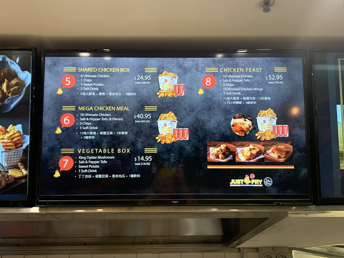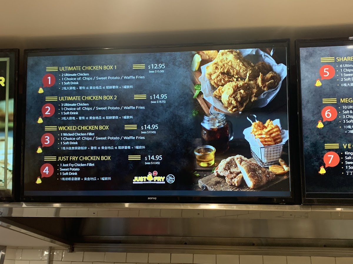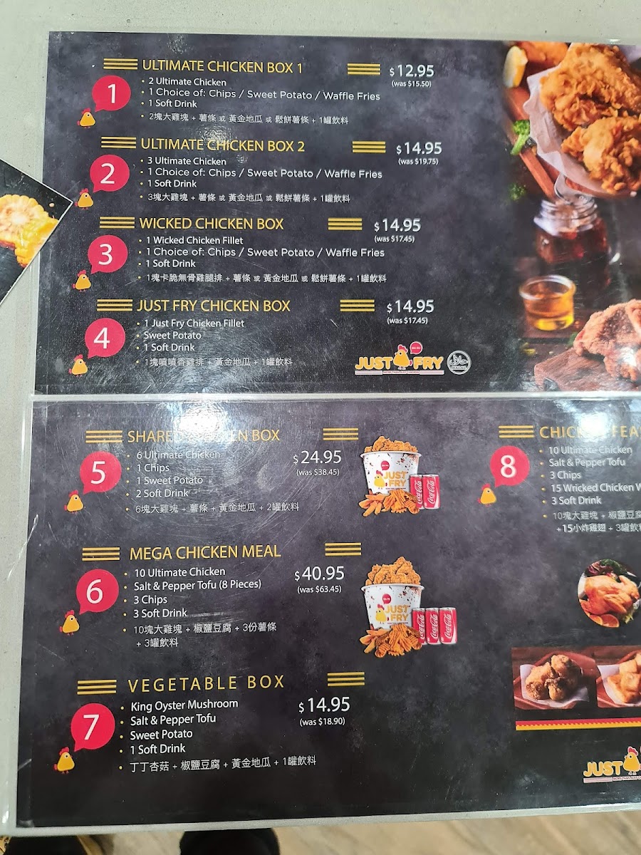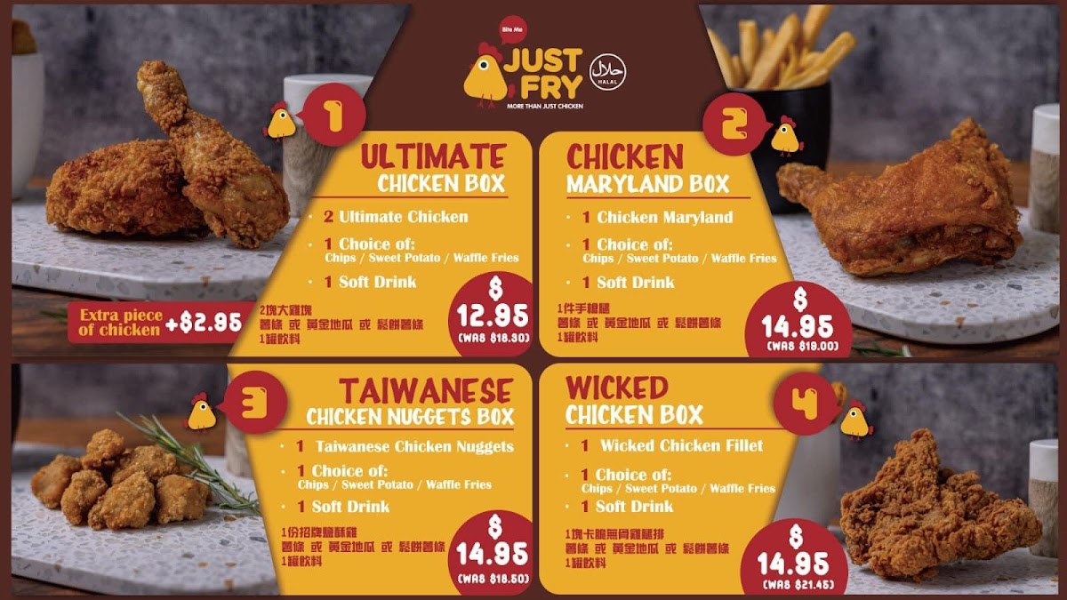 1 Just Fry Chicken Fillet 1 Choice of: Chips / Sweet Potato / Waffle Fries 1 Choice of soft drink.
